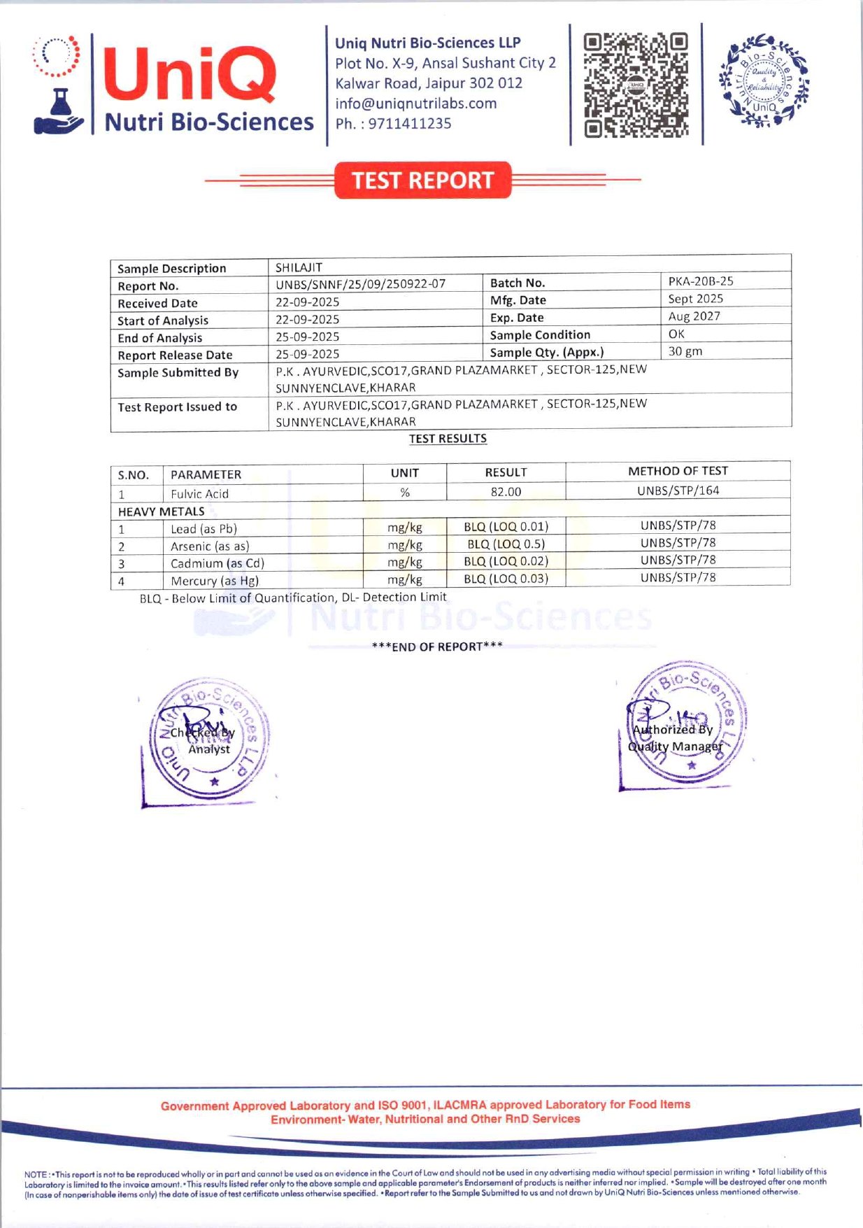At PK Ayurvedic, we believe in delivering authentic wellness through purity and trust. Our Pure Shilajit Resin is crafted with care under strict GMP (Good Manufacturing Practices) standards to ensure unmatched quality. Every batch is NABL-certified for purity and safety, giving you the confidence of choosing the best.